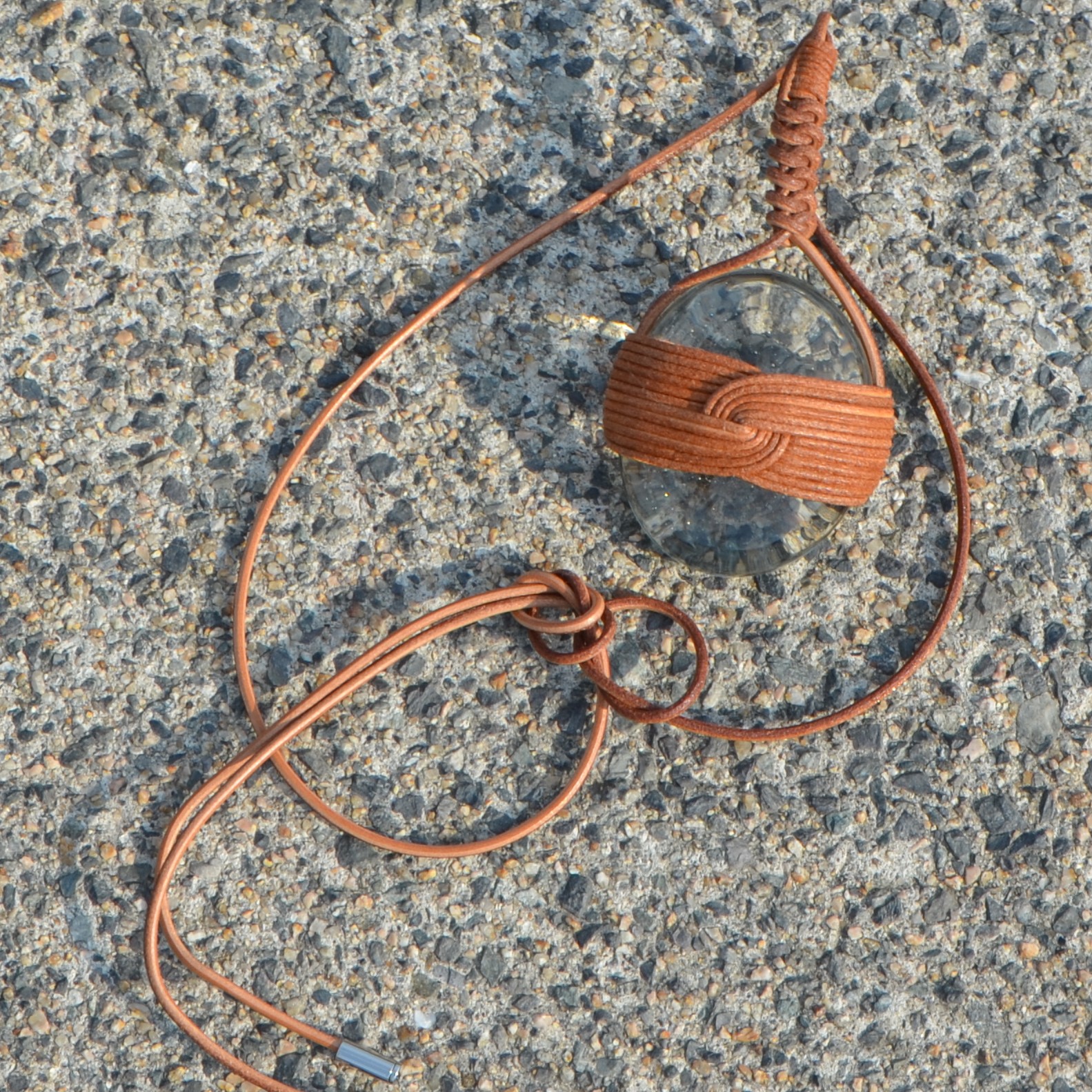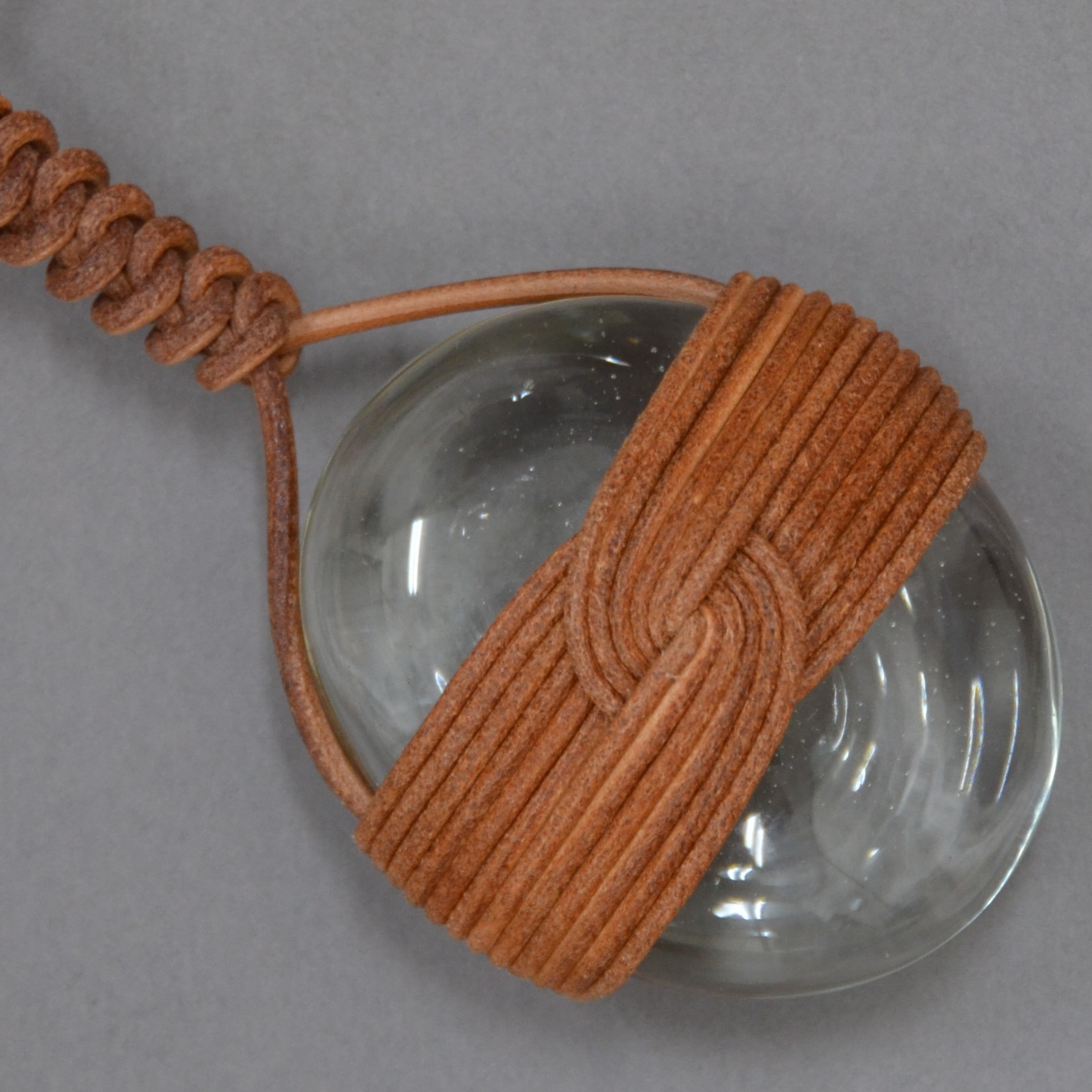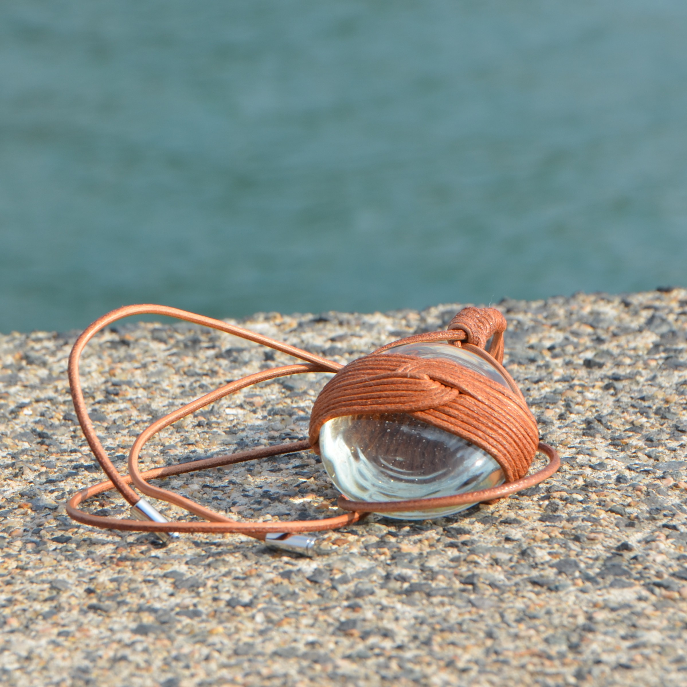 沖縄のアトリエてとてとが手掛けた再生ガラスに、日本の伝統的な結びの技を革紐で施し、深みのある造形を実現しました。