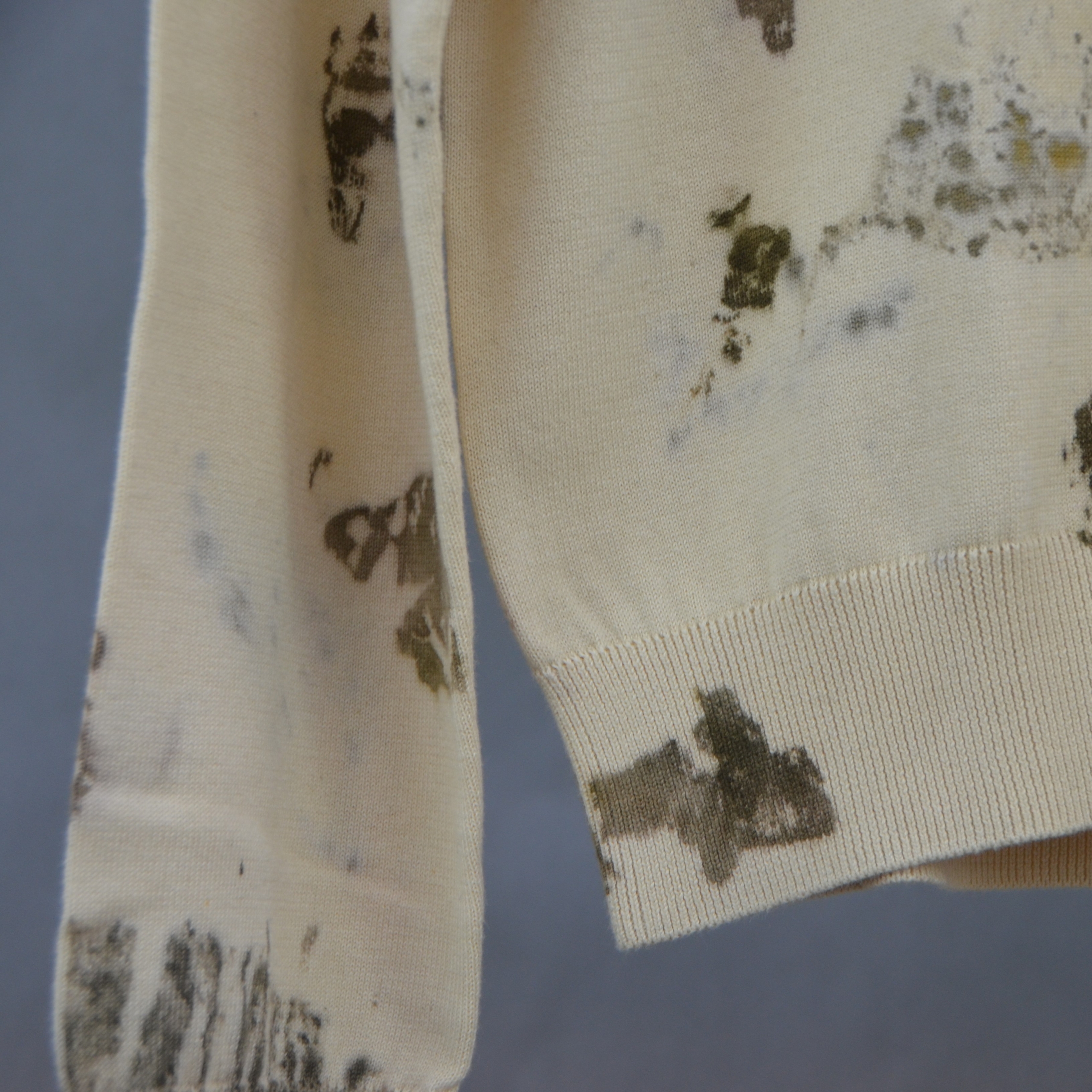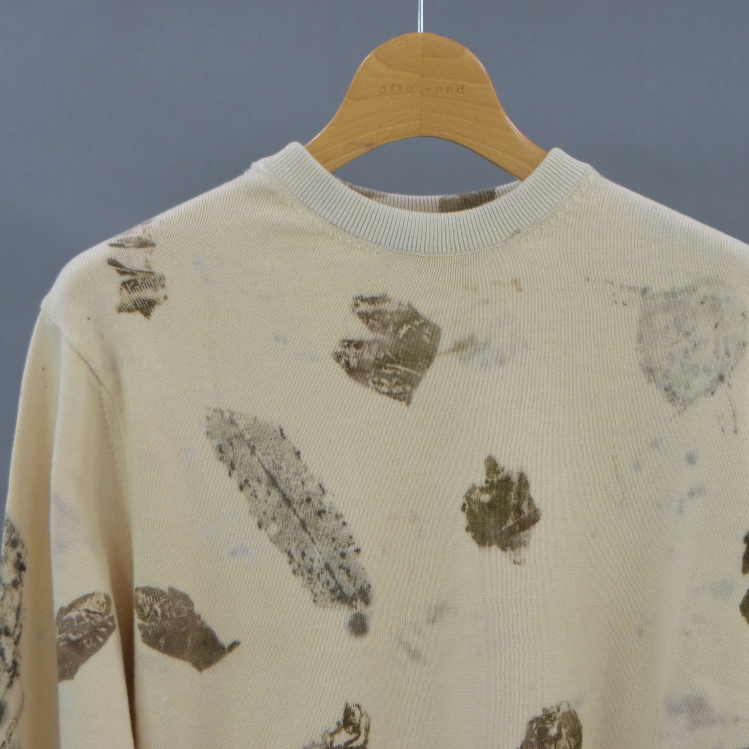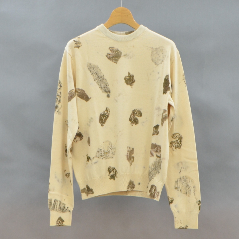 オーガニックコットンのシンプルなクルーネックニット。インドの職人が手作業で施したリーフプリントが、一枚のアート作品のような美しさを演出します。