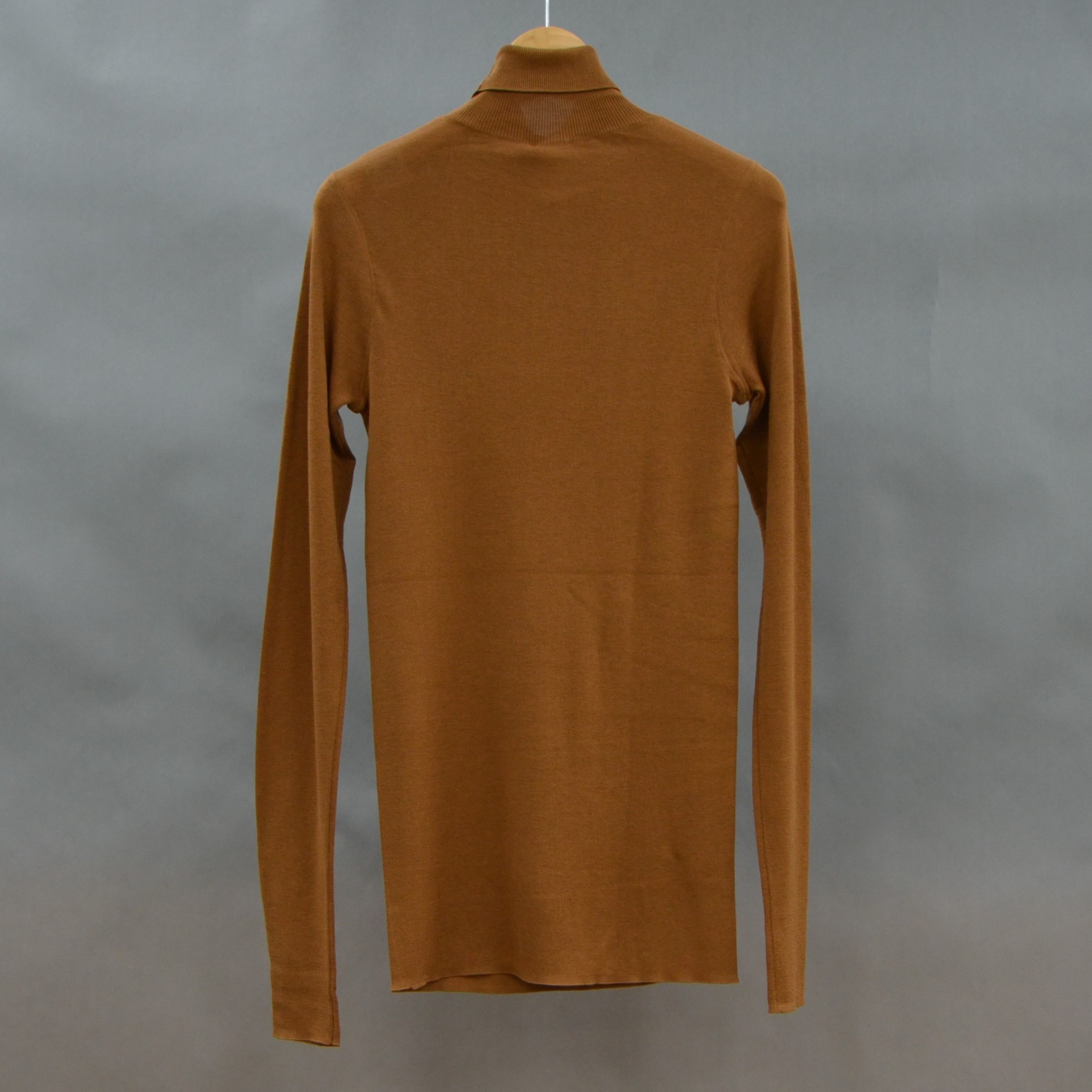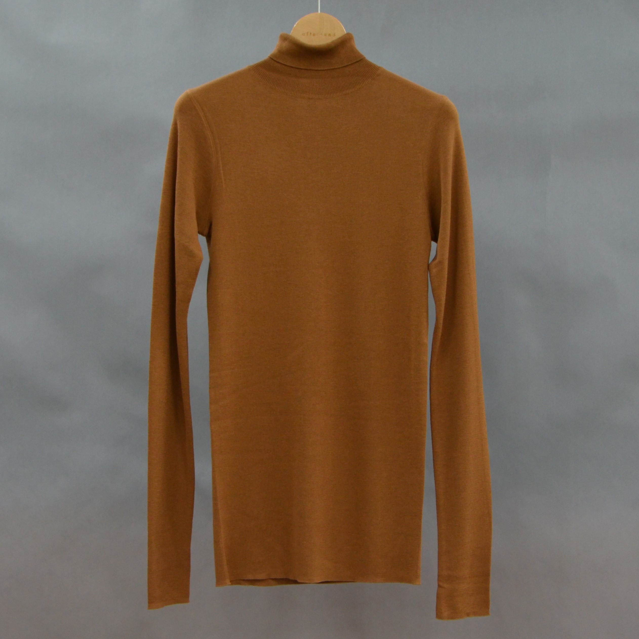 極細2/120シルクコットンを用いた総針編みのタートルネック。