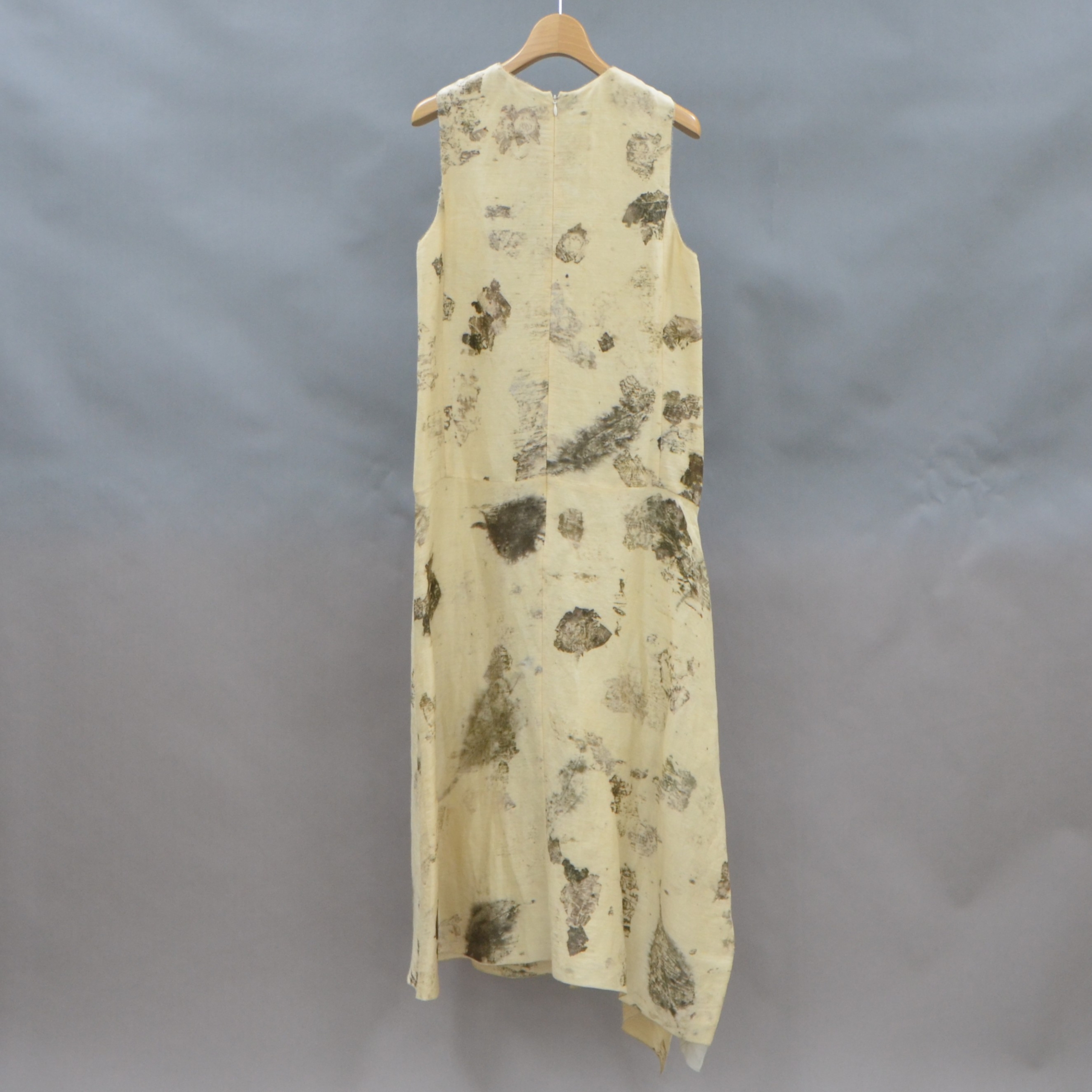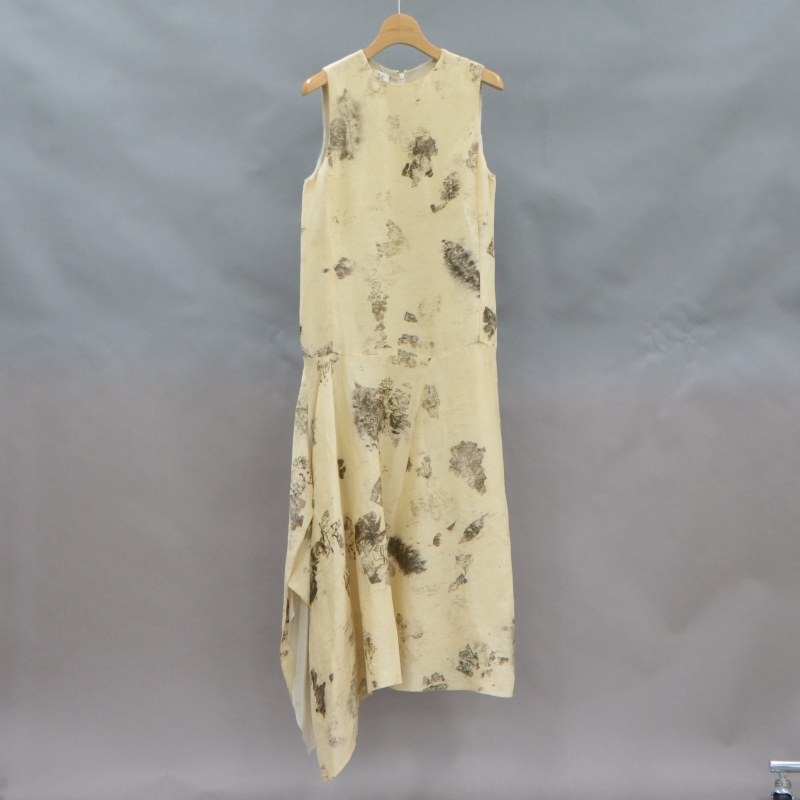 スカート部分をアシンメトリーに仕立てたドレス。 首元と腕まわりには生地の耳を挟み込み、フリンジのような表情をつくっています。スリットも耳をそのまま活かした仕様。