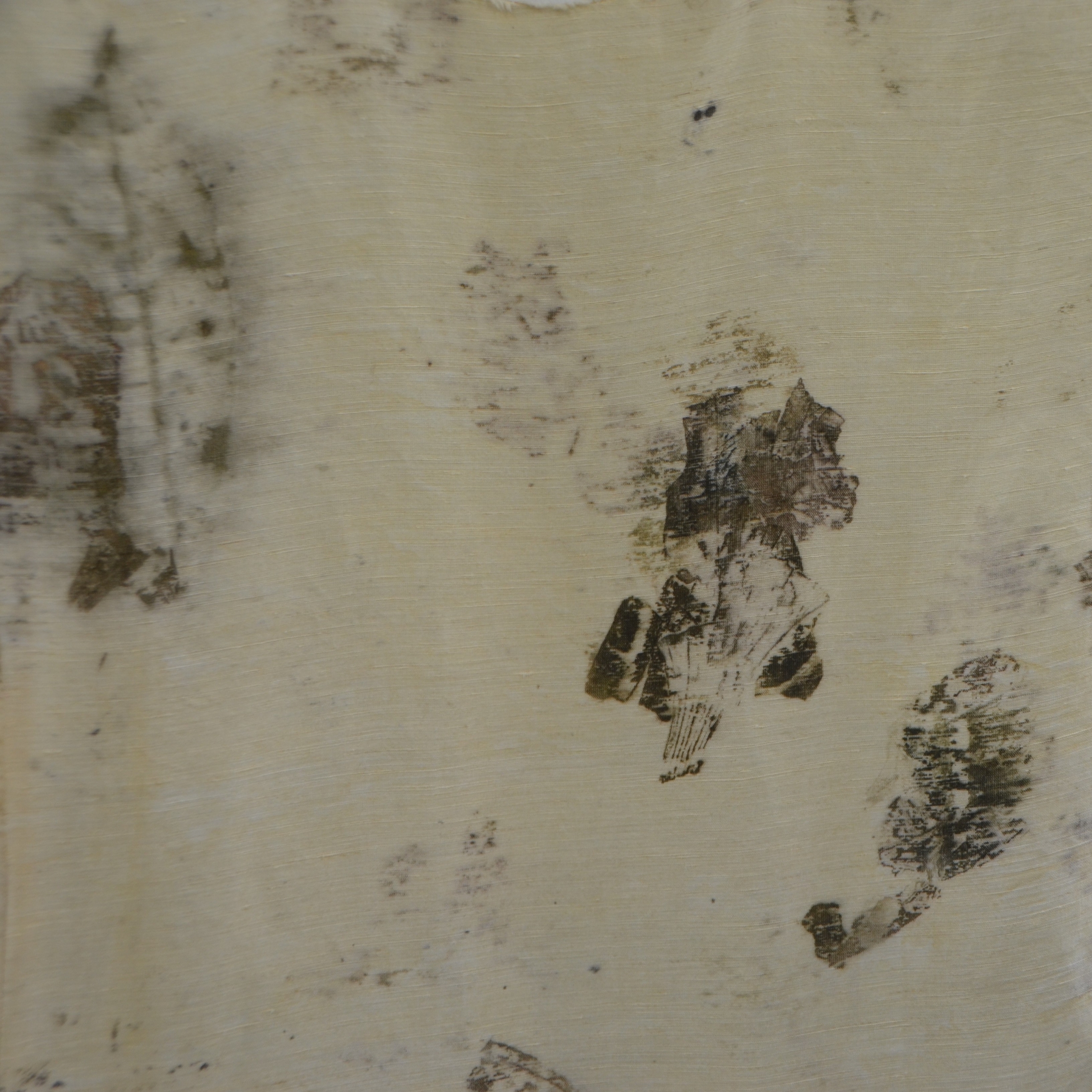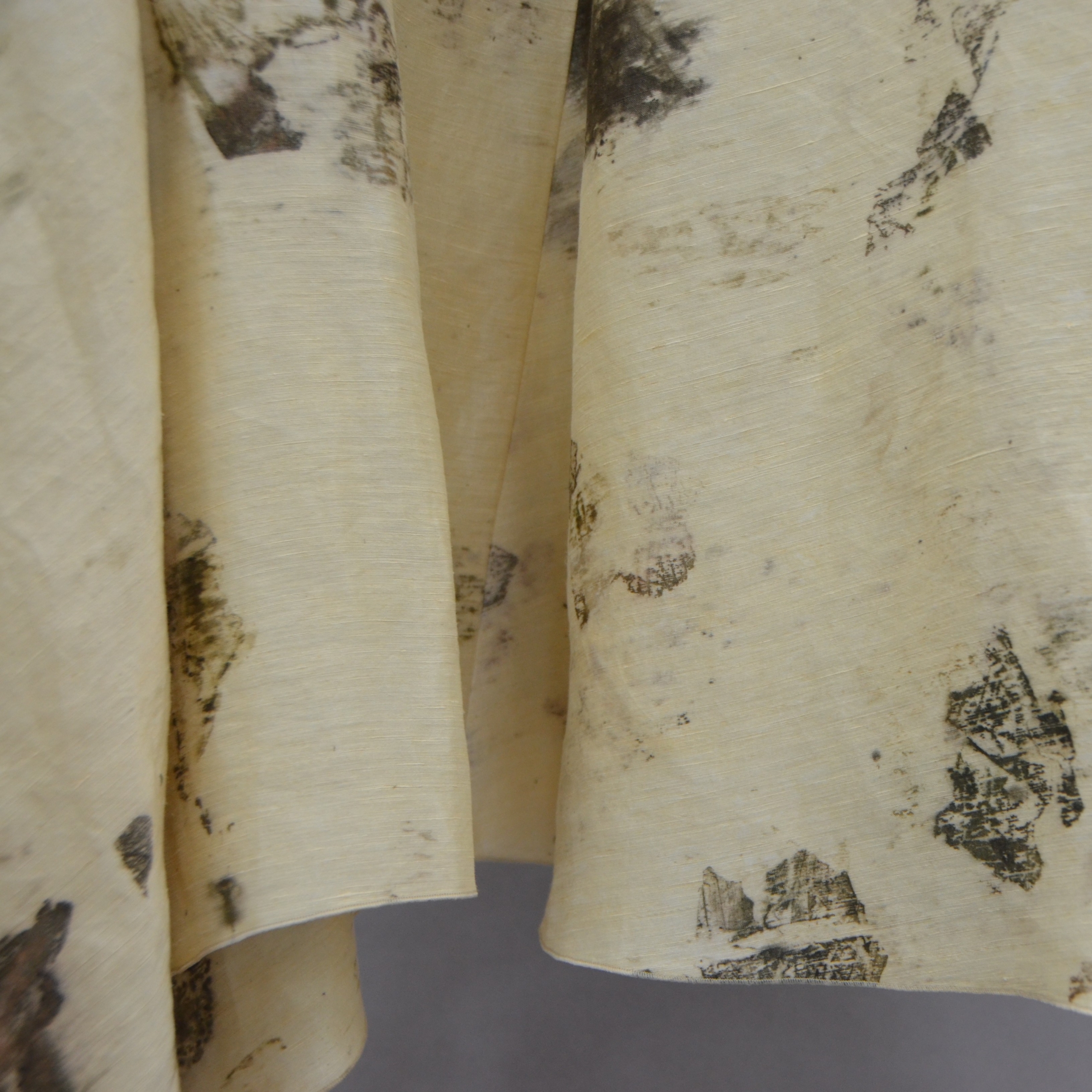 6mずつ織り上げた生地を3mごとのパネルに分け、バラと菩提樹の葉をのせて、ミョウバン・玉ねぎの皮・マリーゴールドを媒染に“押し花”のようにプリントしています。